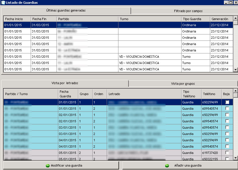 • Control de coincidencias de letrados en diferentes listas en las que pudiese estar, con notificación al usuario y opción a autocorregir las guardias.